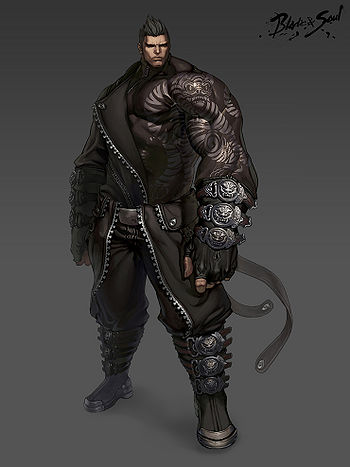 A Giant covered with tattoos and body armour.