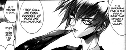He is the self-proclaimed "Punk Goddess of Fortune". Kikunosuke was born with one hand in shape of a blade and as a result was rejected at birth and by his foster parents, hence his hatred for the humans.