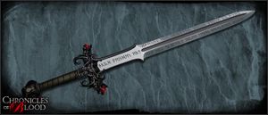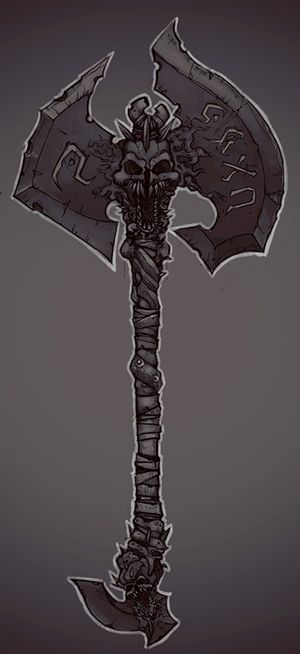 Defiler: Gaen's battle axe. A simple, vicious looking axe, which was forged in the blood of several dozen infidels. The axe has been rendered virtually unbreakable due to this, and it is always preternaturally sharp. It has little to no special ability save for those two, but combined with Gaen's strength and skill, it lets him cleave though men and horses with ease, and no door has been known to resist it.